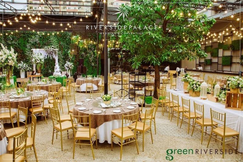 Đây là kiểu bố trí quen thuộc trong nhiều nhà hàng tiệc cưới và trung tâm sự kiện, thường sử dụng các bàn tròn từ 6–10 người.