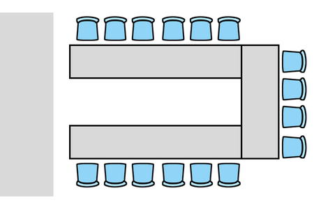 Layout chữ U được thiết kế theo hình dạng chữ “U”, với bàn ghế xếp thành ba cạnh để chừa một khoảng trống hướng về phía trung tâm hoặc sân khấu.