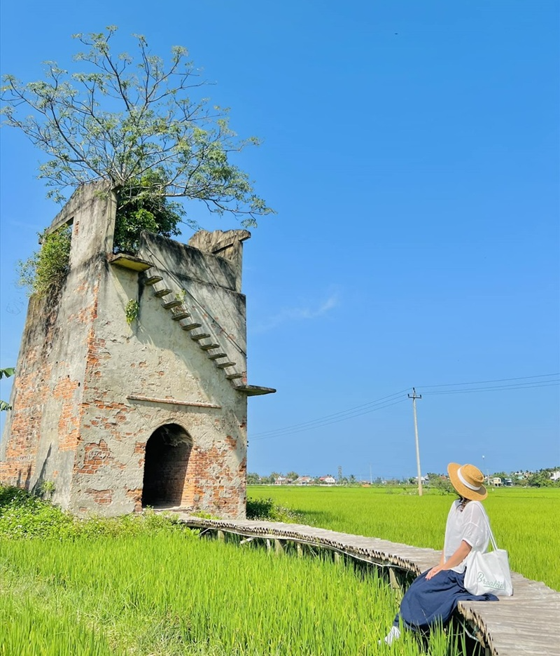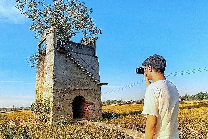 Leo lên những bậc thang gạch cũ kỹ dẫn ra đỉnh, bạn sẽ được thưởng ngoạn tầm nhìn rộng mở: cánh đồng nối tiếp nhau bất tận, con đường làng quanh co, mái nhà ẩn hiện trong màu xanh của cây lá. Cảnh vật trở nên rực rỡ hơn khi ánh nắng ban mai dát vàng lên đồng ruộng, hay khi hoàng hôn buông xuống, nhuộm đỏ cả bầu trời. Khoảnh khắc ấy không chỉ khiến tâm hồn bạn xao động mà còn tạo nên những bức ảnh toàn cảnh đầy ấn tượng.