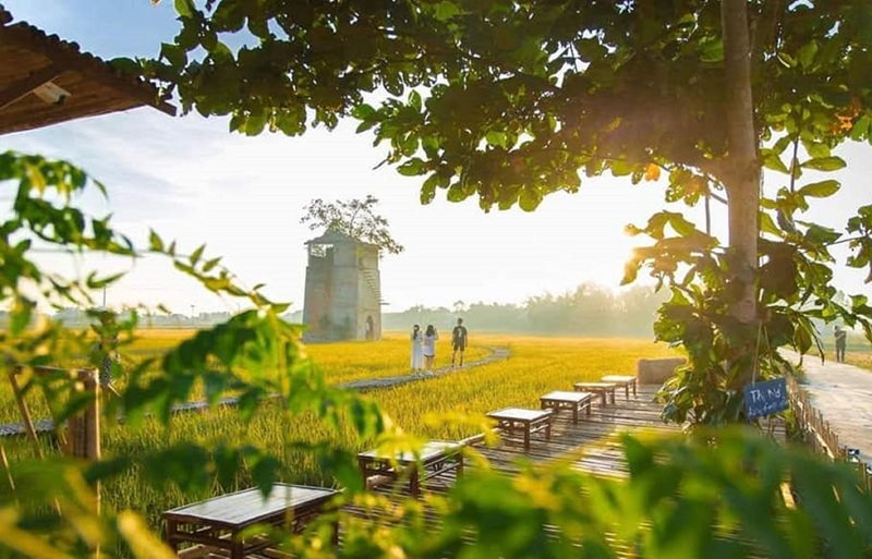 Bao quanh lò gạch là cánh đồng lúa xanh rì, mùa gặt lại hóa vàng rực rỡ, xa xa là con sông nhỏ uốn lượn cùng rặng tre làng vi vu trong gió. Tất cả hòa quyện thành bức tranh đồng quê tươi đẹp, trong trẻo và đầy chất thơ. Đặt chân đến đây, du khách dễ dàng tìm thấy cảm giác an nhiên, tách biệt hoàn toàn với sự náo nhiệt phố thị. Đây chắc hẳn là một điểm đến lý tưởng cho những ai đang tìm kiếm hành trình “du lịch chậm”.
